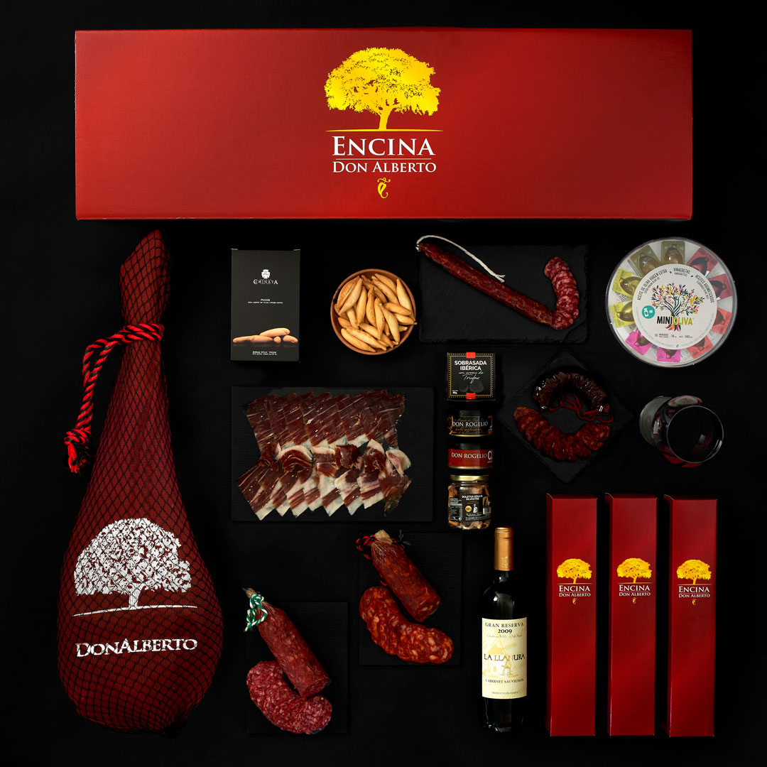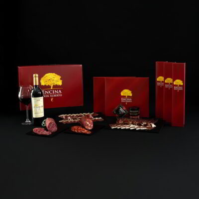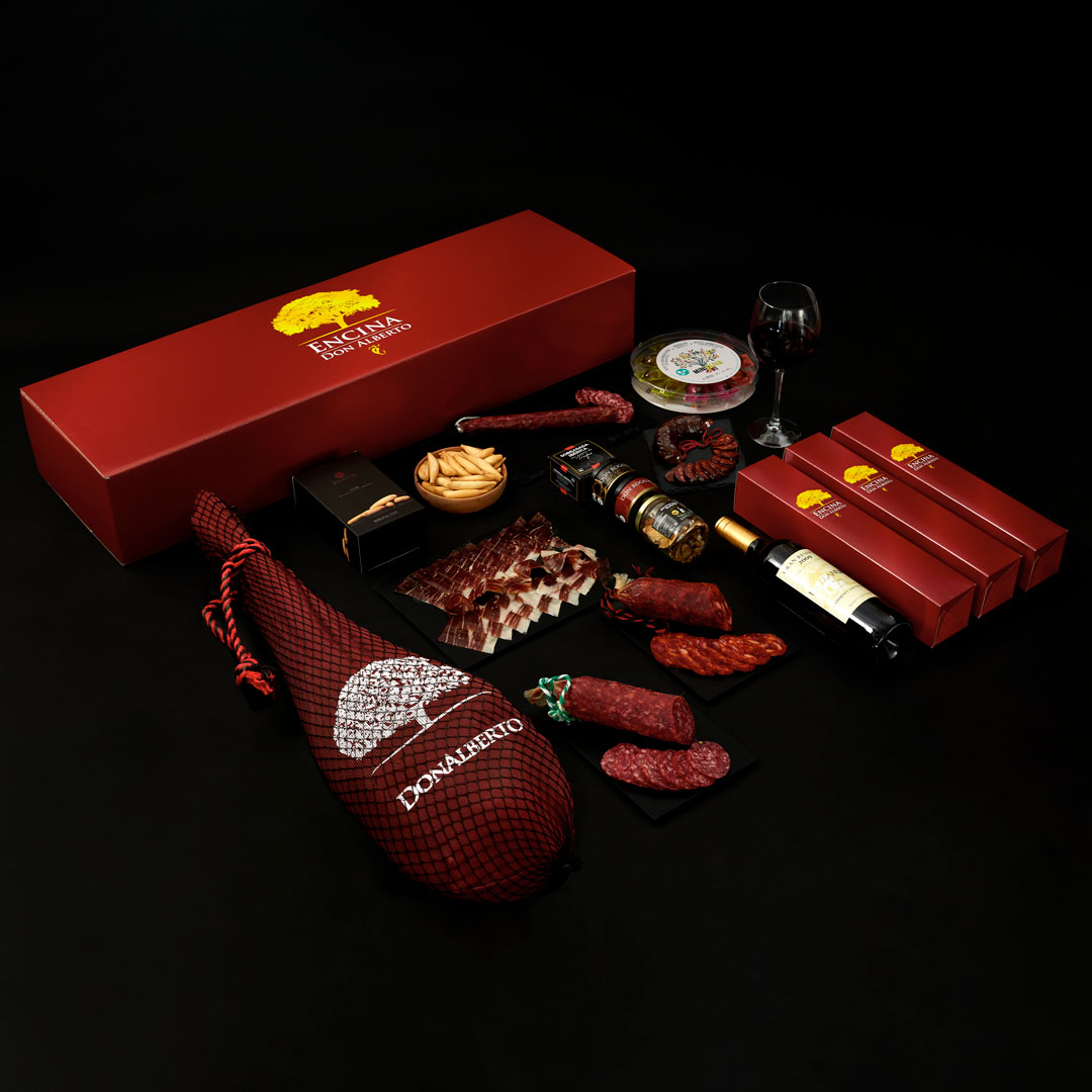 Cet emballage consiste une présentation spéciale pour cadeau. Pour cela on utilisera une caisse de cadeau avec une conception élégante. Chaque pièce jambon ou épaule, outre son étiquetage, scellés et couverture textile, sera empaquetée dans une caisse de cadeau de manière individuelle et pourra être accompagné de certaines de nos charcuteries que choisit le client.
