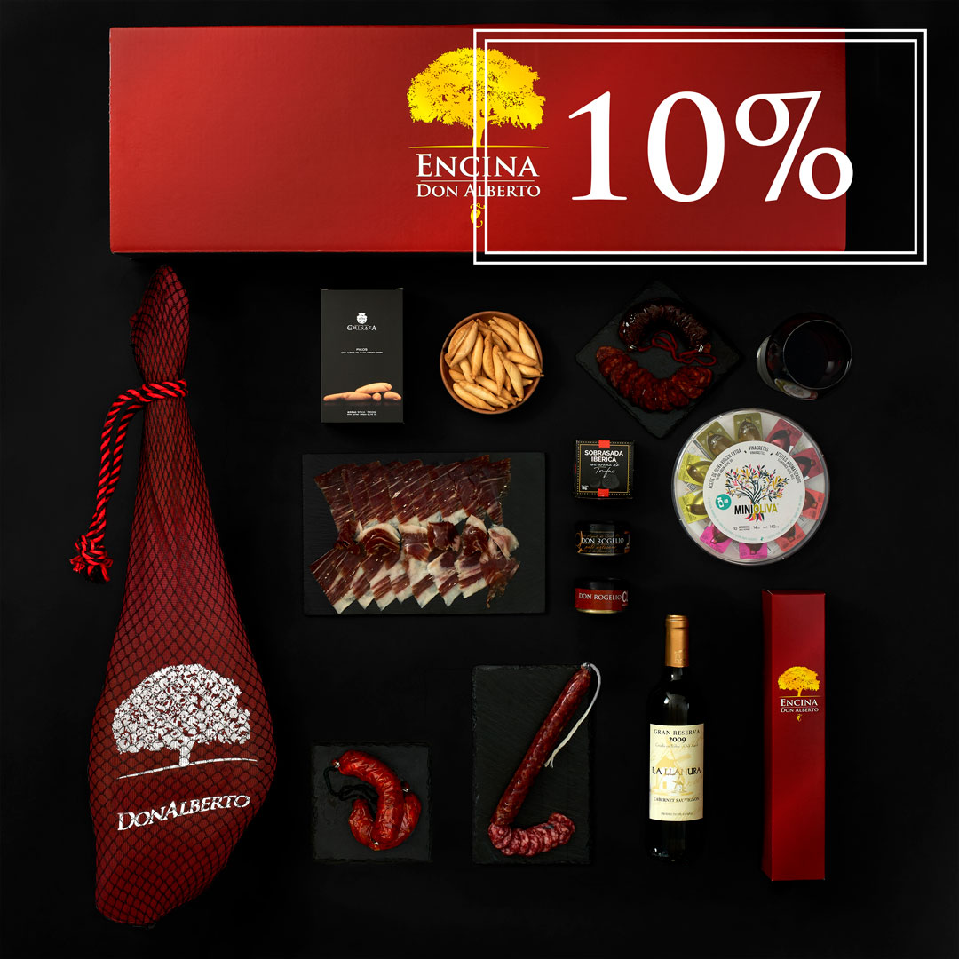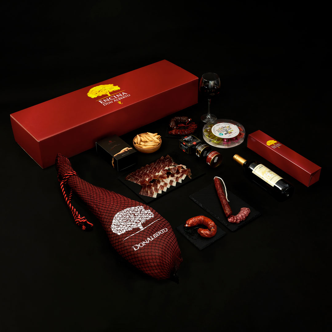 Cet emballage consiste une présentation spéciale pour cadeau. Pour cela on utilisera une caisse de cadeau avec une conception élégante. Chaque pièce jambon ou épaule, outre son étiquetage, scellés et couverture textile, sera empaquetée dans une caisse de cadeau de manière individuelle et pourra être accompagné de certaines de nos charcuteries que choisit le client.