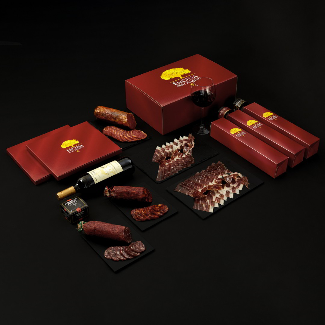 Lote de embutidos ibéricos de bellota de la Sierra de Huelva, acompañado de productos delicatessen típicos de Andalucía y presentados en un elegante estuche de regalo (Ver descripción)